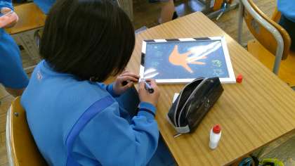 参観日でおうちの方と作った手形アートの仕上げとして、額の飾り付けをしています。ビーズやシールを貼ったり、ペンで絵を描いたりと工夫して素敵に仕上げています。10歳の記念として作った手形アート、もうすぐ持ち帰りますので是非家で飾ってくださいね。