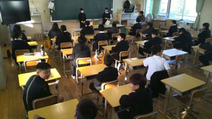 6年梅組さんの朝の会の様子です。6梅の教室って、幼稚園のとんがり屋根や体育館の屋根が見えるのですね。今まであまり気にしていませんでしたが、窓から見える景色も6年生にとっては今日と明日だけですね。