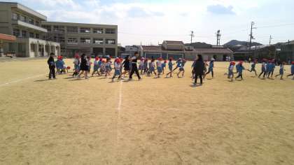 本日の4時間目。6年梅組さんは運動場で遊んでいます。ペットボトルロケットを飛ばしたり、ブランコに乗ったり、1年生の体育に飛び入りしている子もいます。とっても楽しそうですね。