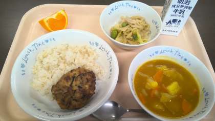 本年度最後の給食となりました。なんと、「ハンバーグカレー」ですね。子どもたちも大喜びです。