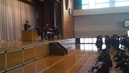 1年間の課程を修了したことを証する「修了証書」を授与する修了式が体育館で行われました。昨年度までの3年間は、各学年ごとに体育館に入って、1年生から5年生までの修了式を5回繰り返していました。今年度は、全学年が集まっての修了式ができました。このような形で終了式を行うことができたのは、実に、平成30年度の修了式以来となります。
