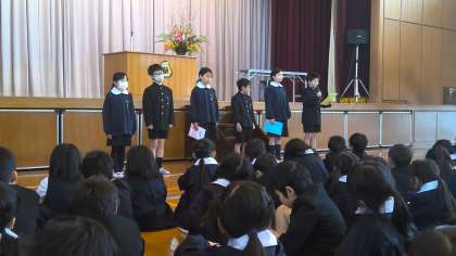 修了式では、4年生の代表の子どもたちに、1年間の思い出やがんばったこと、できるようになったことなどを発表してもらいました。その話を聞きながら、1〜5年生の皆さんも、この1年間を振り返ることができたと思います。