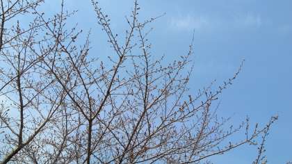 本年度の最終日。3月31日に、とうとう本校の校庭の桜も開花しました。写真が小さくて見えにくいかもしれませんが、白い花びらが、高い木の枝に見えました。この調子ですと、4月8日の始業式、9日の入学式には、まだ、たくさんの花が残っているような気がします。