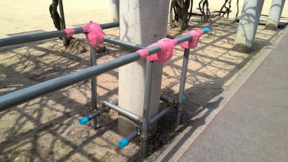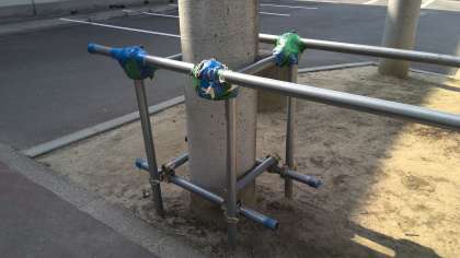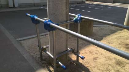 本年度最終の「学校メインテナンス」です。一輪車の練習用手すり(自作)のパイプの継ぎ目には、指を挟まないように中に布を入れてテープを巻いてあります。そのテープがはがれかかっていたので巻きなおしました。
