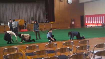 紅白幕を張って、じゅうたんを敷いて、いすや机を並べて…。54名の可愛い新入生を迎えるために頑張っています。