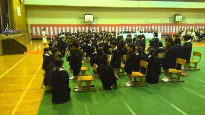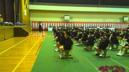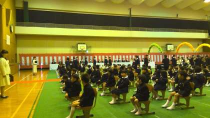 54名の可愛い1年生が入学してきました。6年生のお兄さんやお姉さんに手を引かれ胸を張って入場しました。お名前を呼ばれたら返事をして立ち、私の「ご入学おめでとうございます。」の言葉に、みんなで「ありがとうございます。」と挨拶することもできました。今日から立派な詫間小学校の1年生です。今日から始まる学校生活を、思い切り楽しんでもらいたいなあと思います。
