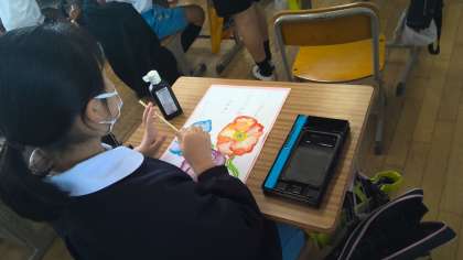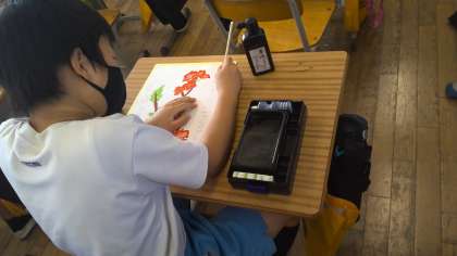 本日の1時間目。5年松組さんの教室に入ると、きれいな花の絵が目に飛び込んできました。「絵手紙」を書いています。花の絵の方はみんな完成していて、今日は、割りばしで作った鉛筆のような物で、墨を付けて言葉を書いています。言葉も、目当てのような素敵な言葉が書かれています。今週の土曜日の参観日に、ぜひ、実物をご覧ください。なかなかの力作です。