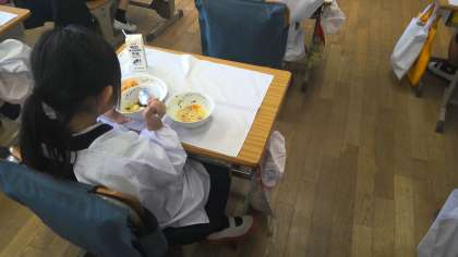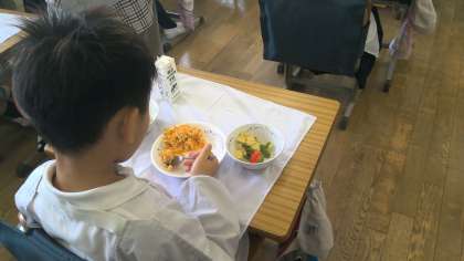 給食を食べ始めました。1年松組の様子です。「とても、おいしい!」と言う声が上がっていました。