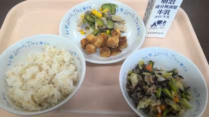〇麦ご飯 〇牛乳 〇豚肉のしょうが炒め 〇高野豆腐の唐揚げ 〇れんこんサラダ