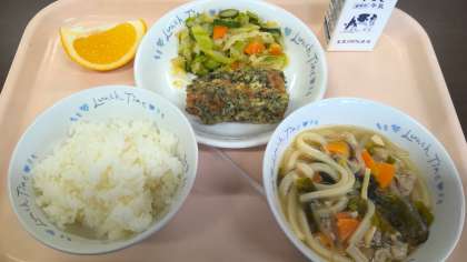【6竹Yさんの食レポ】五目うどんは、出汁がうどんにしみていておいしいです。人参が柔らかくて一番おいしいです。竹輪の新茶揚げは、竹輪が甘くて衣がとんがっているところが好きです。ご飯は、甘いです。キャベツの香り和えは、ちょっと酸っぱくてキャベツがシャキシャキしていておいしいです。ごまの香りが最高です。みかんは、コメントを省略します。