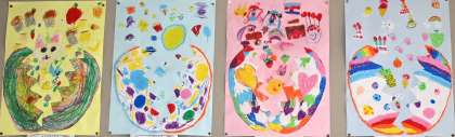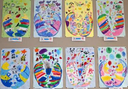 1年竹組教室に掲示している図工の作品です。名前は伏せていますので、どの作品なのかはお子様にお聞きください。授業参観の時に見逃してしまったという保護者の皆様、ぜひご覧ください。なお、階段の踊り場に掲示している作品につきましては先日、既にアップしております。