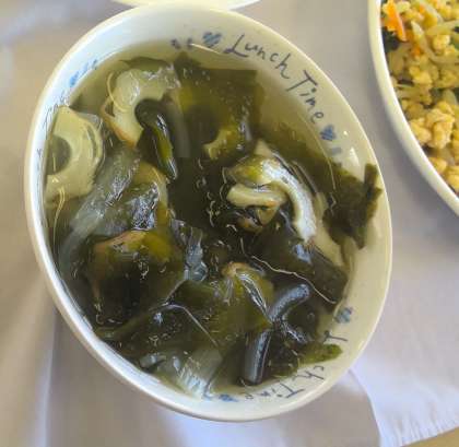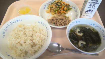 【6梅Mさんの食レポ】(Mさんは、「わかめスープ」が大好きだそうで、増やしていて大盛です。)出汁と具材のバランスがとてもおいしいです。具材ではやっぱりわかめが一番好きです。(写真参照)わかめが大好きなので、わかめご飯も大好きです。給食にもっと出てきたらいいのになあ。(Mさんと校長同意見)(Mさんは、ナムルだけを一口食べて「ナムルだけでもおいしい!」とつぶやきました。)そして、ご飯にかけました。肉のジューシーさと野菜のシャキシャキ感が、麦ご飯といっしょに食べることで引き立っておいしいです。(Mさんは、豚肉だけ集めています。)「おいしい物は、最後にまとめて食べる派」なんです。「パインの入ったゼリー」は、パインがツブツブでおいしいです。(口の中でパインのツブツブみたいなのがはじける感じだそうです。)