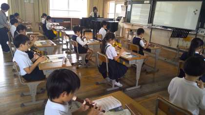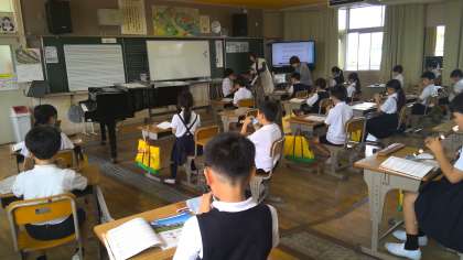 本日の5時間目。4年松組さんは、音楽の授業です。担当教員の指示がなくても、各自「エーデルワイス」の曲をリコーダーで練習し始めました。授業が始まると、いい姿勢で、いい声で歌い、「エーデルワイス」のリコーダーの演奏をしています。とても美しいリーコーダーの演奏です。(ブログでは音をお届けできないのがとても残念です。)その上に「タンギング」を意識して演奏をする練習をしています。数分しか経過していませんが、とてもリコーダーの演奏が上達しました。素晴らしいです。お家の方にも聞いていただきたい演奏です。
