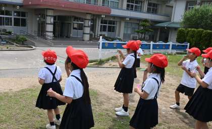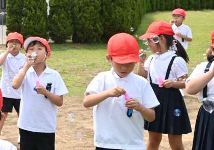 校長室に戻ってくると、芝生広場から何やら楽しそうな声が…。覗いてみますと1年竹組の子どもたちがしゃぼん玉を作っていました。急いでカメラを持って外に出たのですが、並んで教室に帰るところでした。「よかったらもう少ししゃぼん玉をお願いします。」とお願いしたら、快く引き受けてくれました。いいお顔しています。