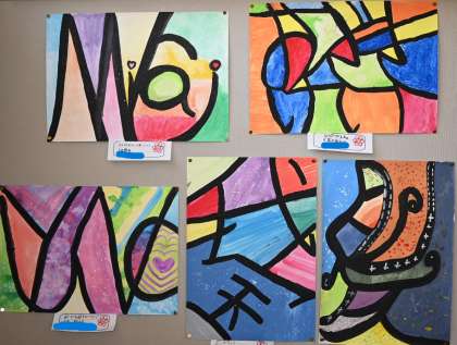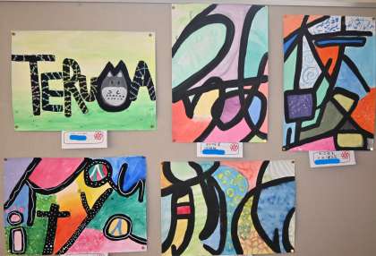 階段の踊り場に掲示している5年生の図工の作品の続きです。