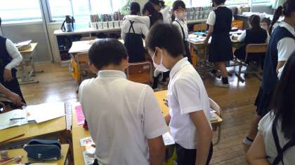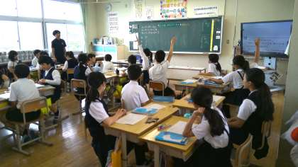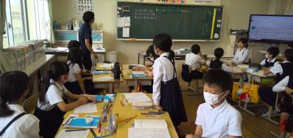 本日の2時間目。6年松組さんは、算数の授業です。今日は、「分数で表された割合」について考えています。6松さんは、友達を見つけて自分の考えを説明し合う、全体の場で、自分の考えを説明するといった活動にしっかりと取り組んでいます。どんどん話していくうちに、考え方もしっかりと身に付いてきているようですね。落ち着いて全員が集中して学習に取り組んでいる姿も、さすがは6年生と感じさせられました。