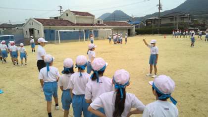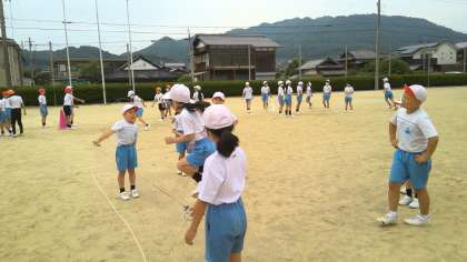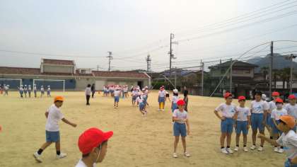 今日から、体育集会は「大なわとび」になりました。2、3,5年生が、「ハイ・ハイ」と声と心を合わせて大なわとびの練習をしています。