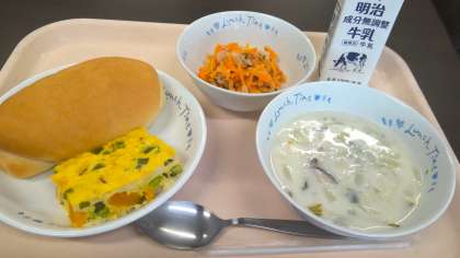 今日の給食の色彩がいいですね。オムレツの鮮やかな黄色、サラダの鮮やかなオレンジ色、そして、チャウダーの白。その他のことは、6年生の食レポにお任せします。