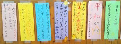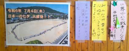 7月4日に実施された児童会主催の「日本一の七夕をしよう」で、10mもの笹に飾った「クラスの願い事を書いた短冊」が、1階パントリー前に掲示されていましたのでご紹介します。