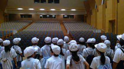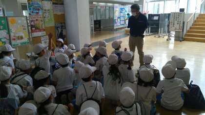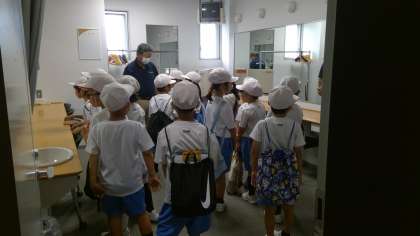 7月10日(水)。3回目となる町探検はマリンウェーブに行きました。イベントや発表会、習い事等で馴染みのある施設です。「何部屋くらいあるのかな。」「1日にどれくらいの人が来るのかな。」と様々な質問を考えており、子どもたちも楽しみにしていました。マリンウェーブでは、まずマーガレットホールのステージや、普段私たちが利用することのない楽屋を見せていただきました。ステージの広さや音の響きのよさ、楽屋にある大きな合わせ鏡に大興奮の子どもたちでした。その後、職員の方からお話を伺い、数多くのマリンウェーブの秘密を知りました。ぜひご家庭でも、「今日学んだ秘密を教えて。」とお子さんに尋ねてみてくださいね。マリンウェーブの後はコーサイ公園に立ち寄る予定でしたが、熱中症予防のため、本日は公園を断念しました。しかし、マリンウェーブの方のご厚意により、室内で休憩させていただくことができました。友達とわいわいと楽しそうに過ごす様子が見られました。保護者の皆様も、探検に行くために準備をしてくださり、ありがとうございました。