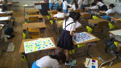 本日の3時間目。3年松組さんは図工の授業です。今日は、画用紙にバックの模様をつけています。「ポンポン」と「ローラー」でバックの模様をつけています。「筆で模様を描いている」子もいますね。その上に、お城の絵や雲に乗った生き物の絵を貼り付けていくそうです。