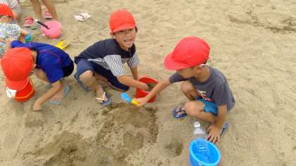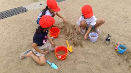 今週、天気のよい時に砂場でどろ遊びをしました。友達となかよく大きな山やケーキなどを作り、「楽しい!もっとやりたい!」と大喜びしていました。