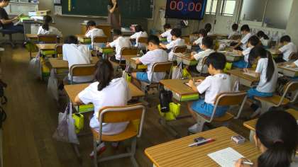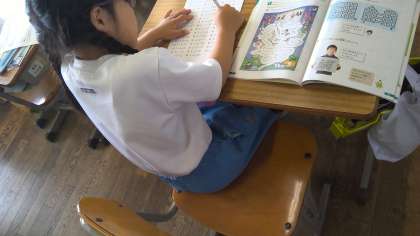 本日の1時間目。3年竹組さんは算数の授業です。今週で1学期も終わりですね。今日は、「九九50題」のプリントを時間制限の中で行っています。真剣にがんばっています。そして、答え合わせをしています。教員が答えを言ったら「はい。」と返事をしながら丸をつけています。