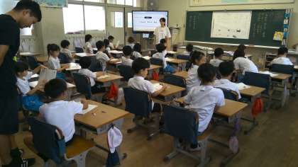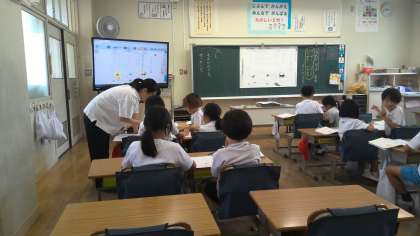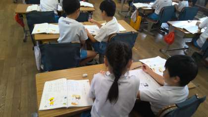本日の2時間目。2年竹組さんは、国語の授業です。今日は、きしだえりこ作の「いろんな おとの あめ」という詩のお勉強をしています。詩は、いくつかのまとまりでできていますが、そのまとまりのことを「連」ということを確認して、詩に出てくる「いろんな音(ぴとん・ぱちん等)」を探して発表しています。そして、その音には「きまり」があることをペアで発見しています。探偵になって推理しているようで楽しそうです。2竹のみなさんは、「『あたって』が同じです。」「音を表す言葉の最後が全部『ん』です。」等のきまりを見つけ出しました。すごいです。
