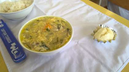 【6竹Tさんの食レポ】(Tさんは、他人丼をお代わりにお代わりを重ね、器からこぼれそうなくらいいっぱいです。写真参照)「太刀魚」は塩が効いていて、(初めてではないかもしれないけれど)初めて食べましたがとてもおいしかったです。「青菜のごま和え」は、小松菜とキャベツの相性がばっちりです。「他人丼」は、具材がたくさん入っていて、出汁が効いていて、ご飯とよく合います。「桃の蒸しパン」は、甘い香りがして、後から桃の香りがしておいしかったです。