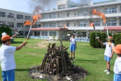 本日、5年生のクラス代表が芝生広場に集まって、「キャンプファイアー(点火のセレモニー)」のリハーサルを行いました。3階の教室から、5年生の子どもたちが見守ってくれていました。リハーサルは成功し、当日が、いよいよ楽しみになってきました。