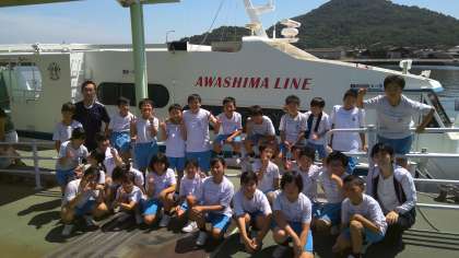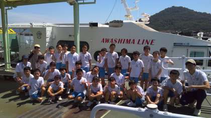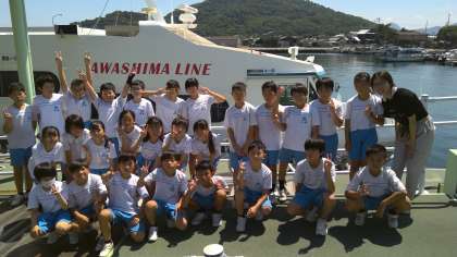 須田港でクラスごとに記念撮影です。バックは、これから乗る船です。