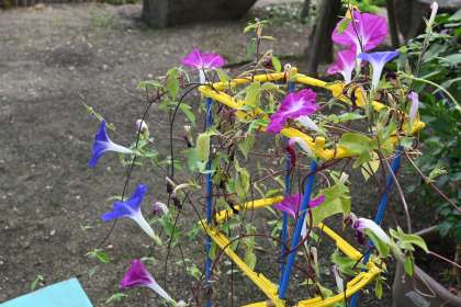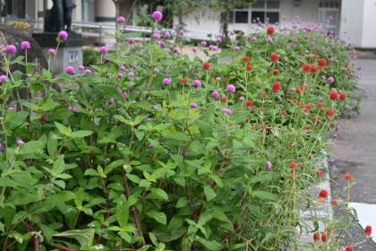 児童玄関付近には、花壇があり、そこには「千日紅」という名前の花が植えられています。用務員さんが、年中、お花の手入れや植え替えをしてくれるので、詫間小学校では、美しい花を、ごく当たり前に目にすることができるのです。千日紅は5月頃から11月頃まで、1年間の半分以上開花しますが、見頃は7〜8月の夏の花です。その千日紅の後ろに、1年生が育てている夏の花「朝顔」が、まだ、たくさん美しい花を咲かせていました。気温も花も夏のままのようです。