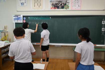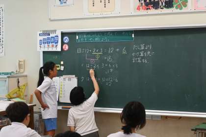 そして、それを説明する活動をしています。黒板の前に出て「まず、2×3をして6。12に6をたして18。答えは18です。」のように上手に説明し、その上、「たし算やひき算とかけ算やわり算が混じっている時は、かけ算やわり算を先にするので、まず、2×3をして6。12に6をたして18。答えは18です。」といったことをペアで説明をし合っています。これで計算の順序は完璧ですね。