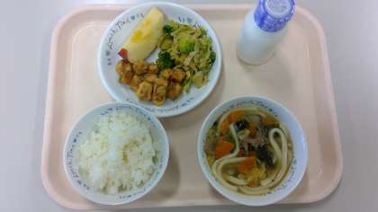 ○ ご飯 牛乳 肉うどん 高野豆腐の唐揚げ ブロッコリーのおひたし りんご