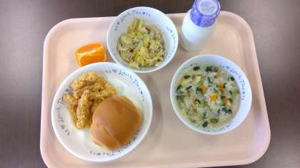 ○ パンに雑炊という組み合わせも「給食ならでは」でしょうか?育ち盛りの子どもたちにはちょうどいいかな。(真鍋)