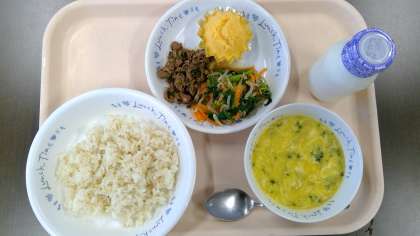 ○ ビビンバ 牛乳 コーンスープ キャロット蒸しパン