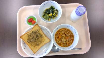 ○ セサミトースト 牛乳 ポークビーンズ 海藻サラダ いちご入り手作りゼリー