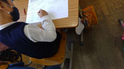 本日の3時間目。2松さんは、算数の授業です。プリントにチャレンジしていました。プリントができたら、2人いる先生が厳しく丸付けしてくれます。がんばってね。もうすぐ春休みです。