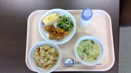 ○ 詫小チャーハン 牛乳 高野豆腐の唐揚げ 小松菜のナムル