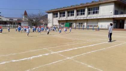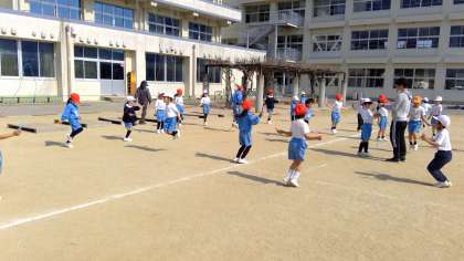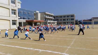 本日の5時間目。1年生は、松、竹、梅組さんともに体育の授業です。今日は、お天気がよくて暖かいので、運動場で体育をしていたら少し暑く感じるくらいですね。