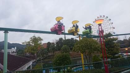 レオマに入園してから1時間。雨が降り始めました。雨は弱い雨なのでカッパを着ていれば大丈夫みたいです。まだ、ここで4時間以上遊べます。