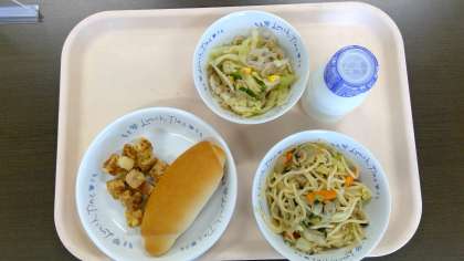 ○ ミニコッペパン 和風スパゲティ ファイバーサラダ こうやどうふの唐揚げ 牛乳