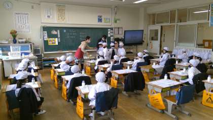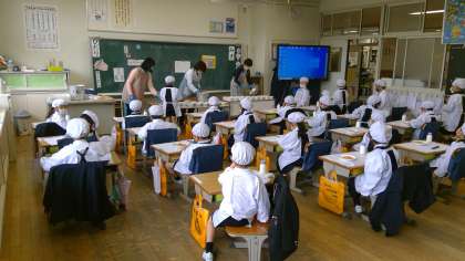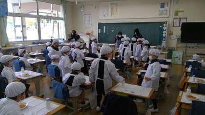 新型コロナウイルス感染防止のため、配膳は教職員が行っています。自分の食器は、自分で取りに行きます。どのクラスも、とても上手に準備できています。