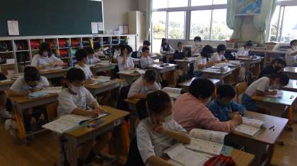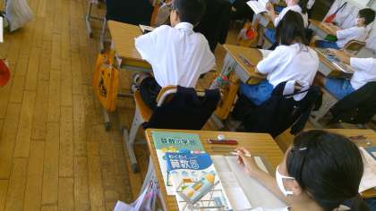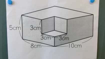 本日の2時間目。5松さんは、算数の授業です。1枚目の写真の図形の体積を求めています。体操服の人が多いのは、1時間目が体育だったからですね。欠けた部分を付け足して、後で引くやりかたで、簡単に体積を求めていました。