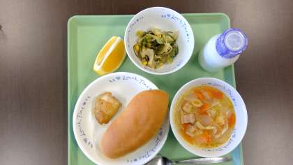 実は、給食調理場が学校内にあるというのは、給食を作っている香りも漂ってくるという恩恵を受けることができるのです。風向きや献立にもよりますが、今日のようにガーリックを使う献立ですと、授業中にいい香りが漂ってきて「今日の給食はチキンだったなあ。ああ、お腹すいたなあ。」と、思うわけです。この嗅覚での楽しみ(我慢を伴うが)も、私は食事の楽しさであると思います。台所からの夕食を作っている香りの中で、宿題をやっているのと同じですね。(真鍋)