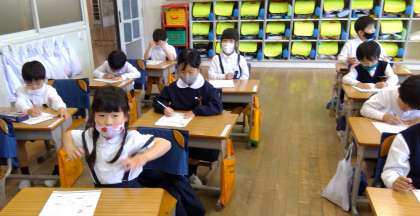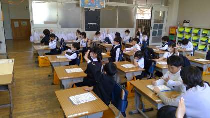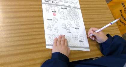 本日の4時間目。1竹さんは、生活科の授業です。「ともだちと あそぼうよ」というお勉強で、ワークシートに、うんてい、ボール投げ、砂遊びなど、お友達とやってみたいなあと思う遊びに色をぬっていました。1竹さんは、先生のお話をよく聞いていますね。素晴らしいです。