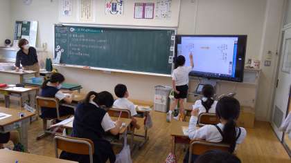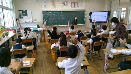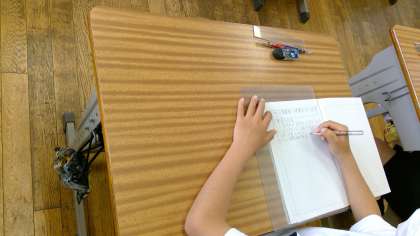 本日の2時間目。4松さんは、算数の授業です。「わり算(筆算・暗算)のまとめをしよう。」の学習をしています。4松さんは、ノートをしっかりと取れています。そして、発表も「つまり・・・」「例えば・・・」などの言葉をつかって上手にできています。