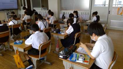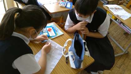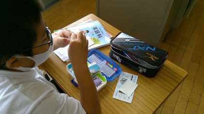 本日の1時間目。5松さんは家庭科の授業です。机の上には裁縫箱。今日は、初めてまち針を使って「なみぬい」に挑戦するみたいですね。