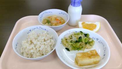 ○ 麦ご飯 牛乳 揚げだし豆腐のみそだれ じゃがいもの煮つけ キャベツのごま和え 河内晩柑