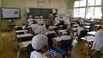 前回は「1年生の帰りの会の様子」でした。今回は、「2年生の給食の準備の様子」です。